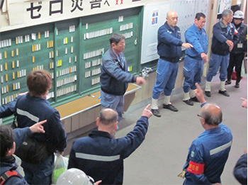 安全管理室からは作業の注意事項の説明と現業員全員による全身の服装チェックがなされます。また、輪番制にて現業員を指名し、当日の安全目標を発表させ、指差呼称を唱和し安全意識を高めます。