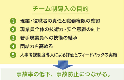現業部ではリーダー、副リーダーを中心としたチーム制(1チーム10名程度)を導入しています。これにより、現業員の技術力、安全意識の向上、若手への指導、団結力が深められ、事故率の低下、事故防止につながります。