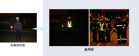 「夜間の荷役中、現業員の移動時に危険を感じることがある」といった機器運転手の意見により安全ベストが導入されました。